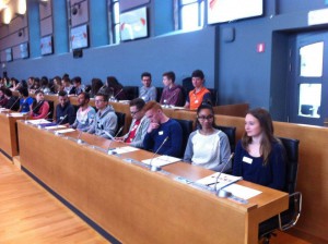 Nos élèves (et professeurs), comme ceux des autres écoles présentes, ont prêté serment devant l’assemblée constituée par les parlementaires d’un jour. Un moment solennel et émouvant pour la plupart d’entre eux. Après lecture devant l’ensemble des participants de notre projet de décret (merci Ali Z.), nous avons pu débattre en commission de ce projet de texte concernant la sécurisation des aéroports wallons. L’après-midi, M. Horemans, responsable du Greffe au Parlement, nous a expliqué dans une grande salle de Commission les tenants et aboutissants du fonctionnement du Parlement, de son organisation, du travail des Parlementaires, du rôle du Greffe etc… Enfin, nous avons rencontré différents députés qui se sont prêtés au jeu des questions-réponses sur les projets de décrets et sur le métier de Parlementaire.