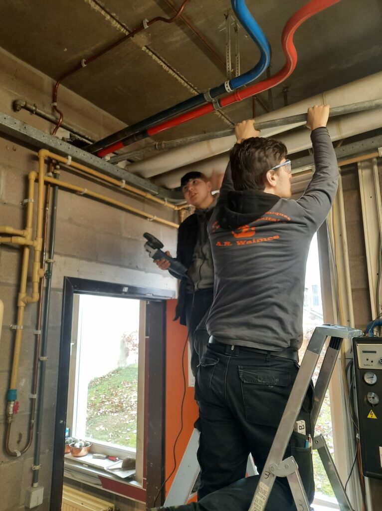 Montage d’une pompe à chaleur dans nos ateliers. Ce travail est réalisé par les élèves de 4e et 5e professionnelle monteur en chauffage et sanitaire ainsi que par les élèves de 5e et 6e TQ technicien en équipement thermique.