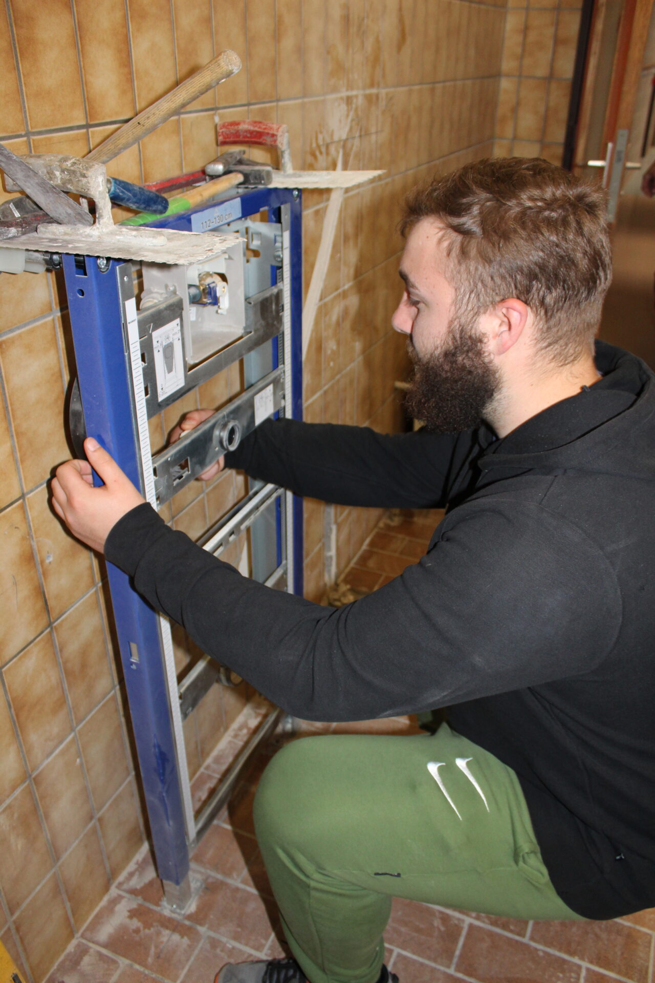 Les élèves de 6e P Monteur en sanitaire et en chauffage s’attèlent depuis quelques semaines à la réfection des toilettes du premier étage près de l’hôtellerie. Une partie des toilettes et des lavabos ont déjà été changés et un nouveau carrelage a été placé. Il reste à finaliser le côté hommes, ce que les élèves sont occupés à faire.