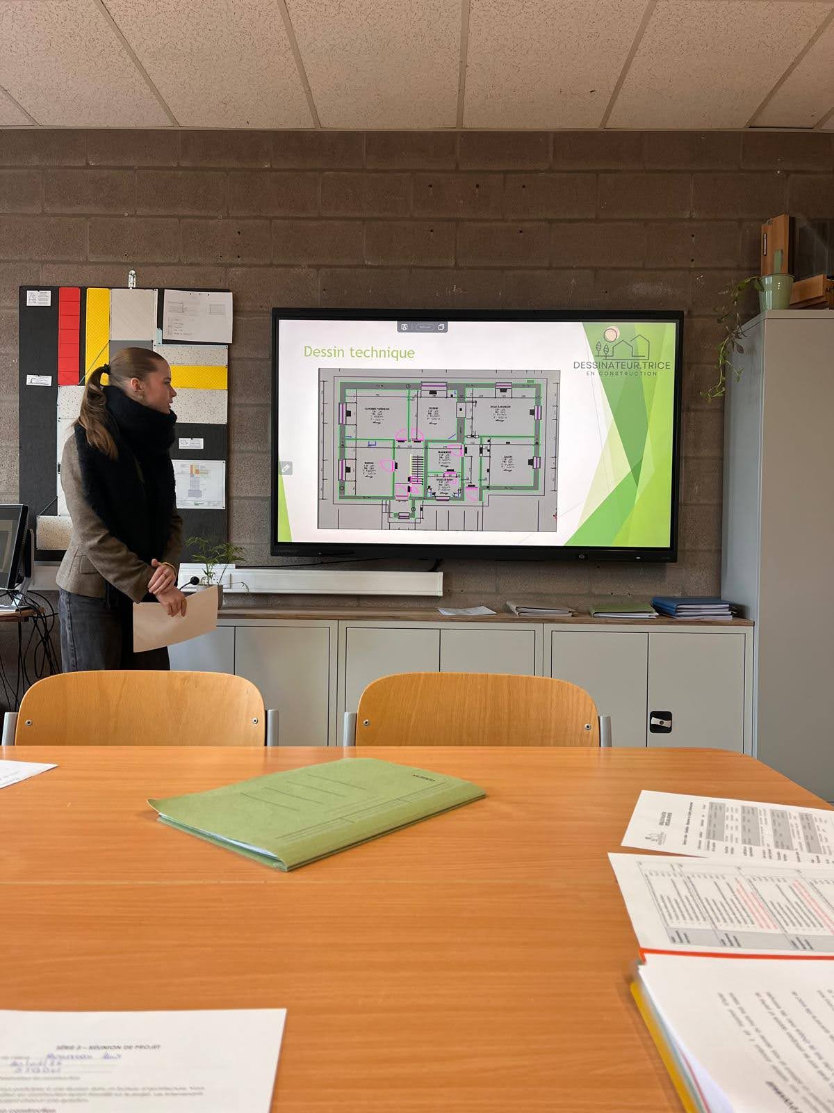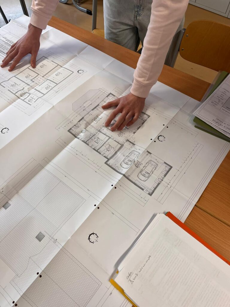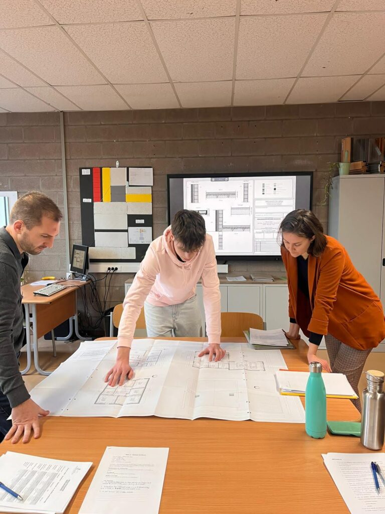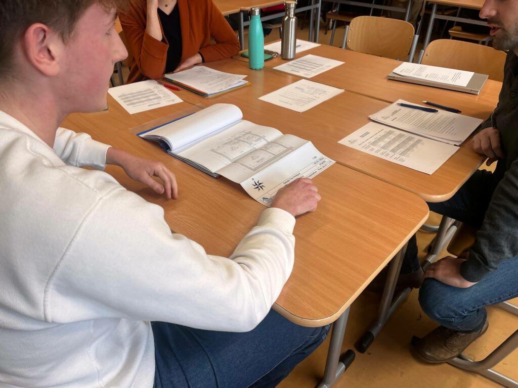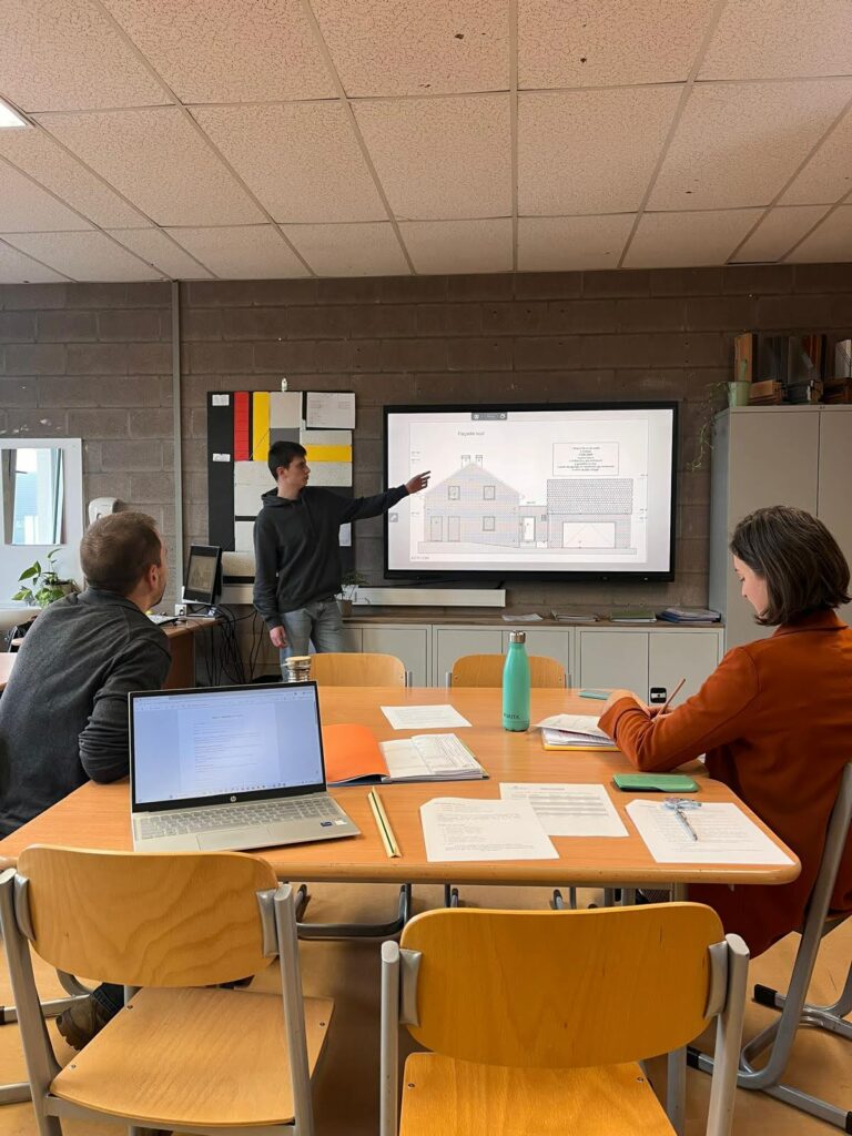 Cette année, les unités qualifiantes ont été organisées sous la forme d’une simulation de journée de bureau, afin de placer les élèves dans une situation professionnelle réaliste. Nous nous sommes réunis autour d’une table de réunion dans un « bureau d’architecture ». L’élève devait présenter son projet devant le maitre d’ouvrage, un entrepreneur de construction et l’architecte.
